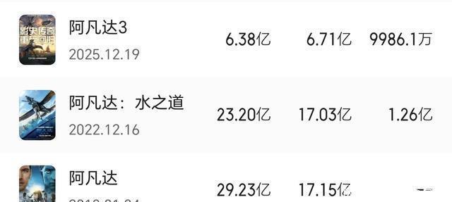 《阿凡达》系列三部电影,全球总票房超410亿人民币,几乎是《哪吒》系列的两倍。 《阿凡达3》的两部前作《阿凡达》和《阿凡达2》,一个是全球票房冠军,全球总票房是29.23亿美元,一个是全球票房季军,全球票房23.2亿美元。这两部电影加起来,全球票房则超过了50亿美元。 如今的续集《阿凡达3》,全球票房是6.38亿美元。如此算下来,《阿凡达》系列三部电影的全球累计总票房则是58.81亿美元,换算成人民币超过了410亿。